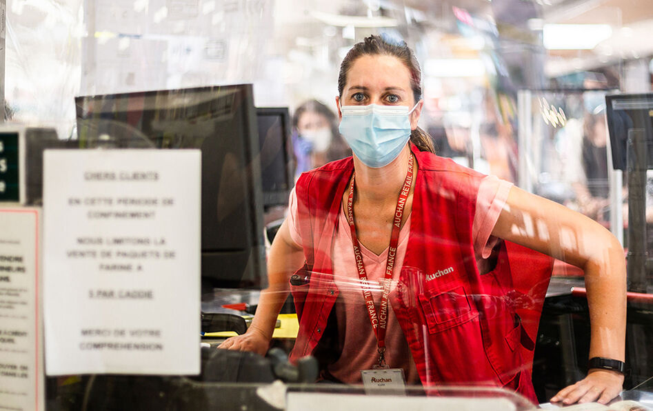 Mai 2020, ses préconisations, ses règles, le port du masque : protégée par une plaque de plexiglas, une caissière de supermarché porte un masque, en période de déconfinement. © Jean-Christophe Milhet/Hans Lucas/AFP