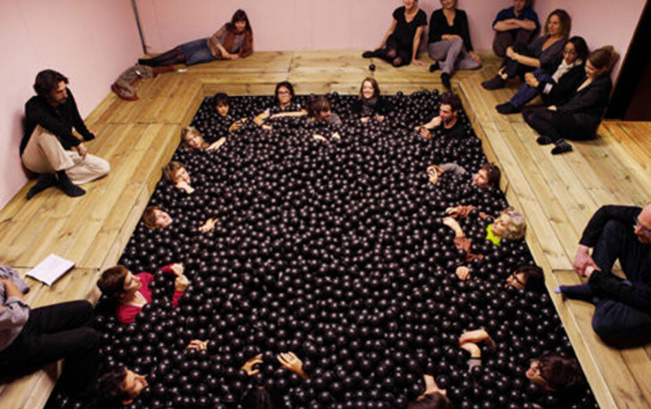 Halory Goeger: Ces Thermes ont été conçus pour offrir un bain de moralité. Ils appartiennent à un ensemble d’installations intitulé France Distraction. Ils sont conçus sur le modèle des spa, afin que l’on puisse s’imprégner de la pensée stoïcienne, dans cet espace boisé, austère et confiné. La lecture se fait en s’immergeant dans une piscine à balles prévue pour une vingtaine de personnes. 23 000 balles noires ont été gravées d’une centaine de préceptes stoïciens. En réalité, ces citations sont extraites à 70% des Pensées pour moi-même, de Marc Aurèle (v. 170-180), et à 30% de L’Homme de cour de Baltazar Gracián (1646)... pour changer un peu la température de l’eau.