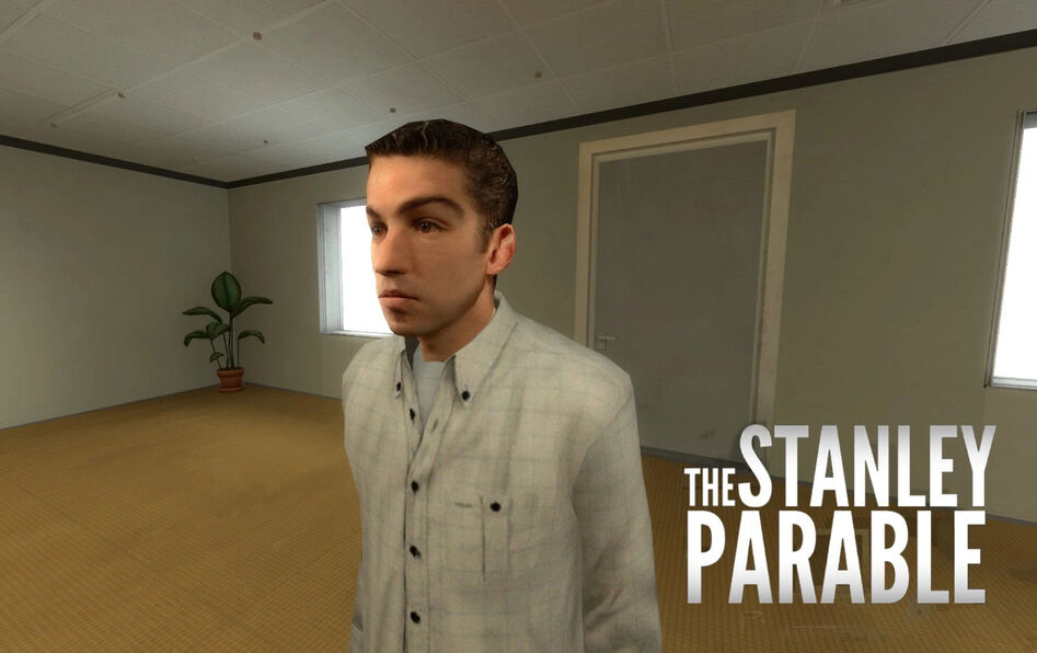 « Ceci est l’histoire d’un homme qui s’appelle Stanley. » Tels sont les premiers mots que nous entendons en lançant le jeu vidéo The Stanley Parable (Galactic Cafe, 2013) sur notre ordinateur. Les premiers instants de l’expérience proposée par le développeur américain Davey Wreden sont ce qu’on appelle une cinématique : une voix off, accompagnée d’une petite musique d’ambiance, plante le décor. Nous allons incarner Stanley, l’employé 427 occupant le bureau 427 d’une grande entreprise indéfinie. Le narrateur nous explique que le travail de Stanley, dont on perçoit la silhouette assise, consiste simplement à appuyer machinalement sur les touches de son clavier lorsque celles-ci s’affichent sur son prompteur. Un beau jour, nous apprend-on, Stanley ne reçoit plus aucune instruction sur sa machine. Il décide donc de s’extirper de son bureau pour comprendre ce qu’il se passe. C’est à ce moment-là que nous pouvons prendre les commandes de son personnage et commencer le jeu, dans une incarnation dite « à la première personne » : nous percevons le décor à travers les yeux du personnage que l’on contrôle.