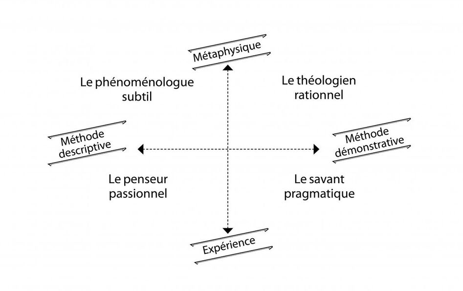 Verticalement, faites la somme de vos réponses * et ✖ et celle de vos réponses ● et ◆. Ne conservez que le résultat le plus élevé : il vous permettra de vous situer sur l’axe vertical du repère suivant. Si * + ✖ > ● + ◆, vous êtes du côté de la métaphysique. Si ● + ◆ > * + ✖, vous êtes du côté de l’expérience. En cas d’égalité, vous êtes sur l’axe.