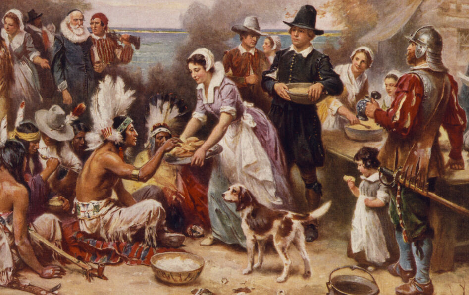 • Thanksgiving est d’abord une fête des moissons, née aux XVIIe siècle parmi les premiers colons anglais en Amérique. En 1620, les Pères pèlerins débarquent à bord du Mayflower, mais les débuts sont difficiles. La moitié d’entre eux meurent, en particulier du scorbut. La petite colonie ne doit sa survie qu’à l’aide de deux Amérindiens, Squanto et Samoset de la tribu des Wampanoags, qui leur offrent de la nourriture, leur apprennent à cultiver le maïs et à chasser les animaux locaux. L’année suivante, les survivants célèbrent la première récolte, et invitent le chef des Wampanoags, Massasoit, et quelques dizaines de ses hommes à partager un repas de fête (où les convives consomment, en particulier, des dindes).