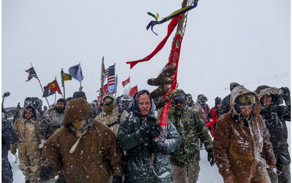 En 2016, une tribu sioux de Standing Rock manifeste pour s'opposer à l’installation d’un pipeline prévu dans le Dakota du Nord. © Hossein Fatemi/PANOS/REA