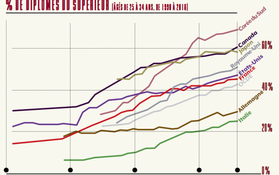 C’est l’une des transformations les plus profondes, et les plus sourdes, des sociétés contemporaines : dans les pays développés, en moins de trente ans, le pourcentage de la population ayant suivi des études supérieures a plus que doublé, devenant parfois majoritaire. En analysant des données sur les trente dernières années, le magazine britannique The Economist relève que, dans les pays de l’Organisation de coopération et de développement économiques (OCDE), ce sont dorénavant 43 % des 25-34 ans qui ont accès à une éducation supérieure.
