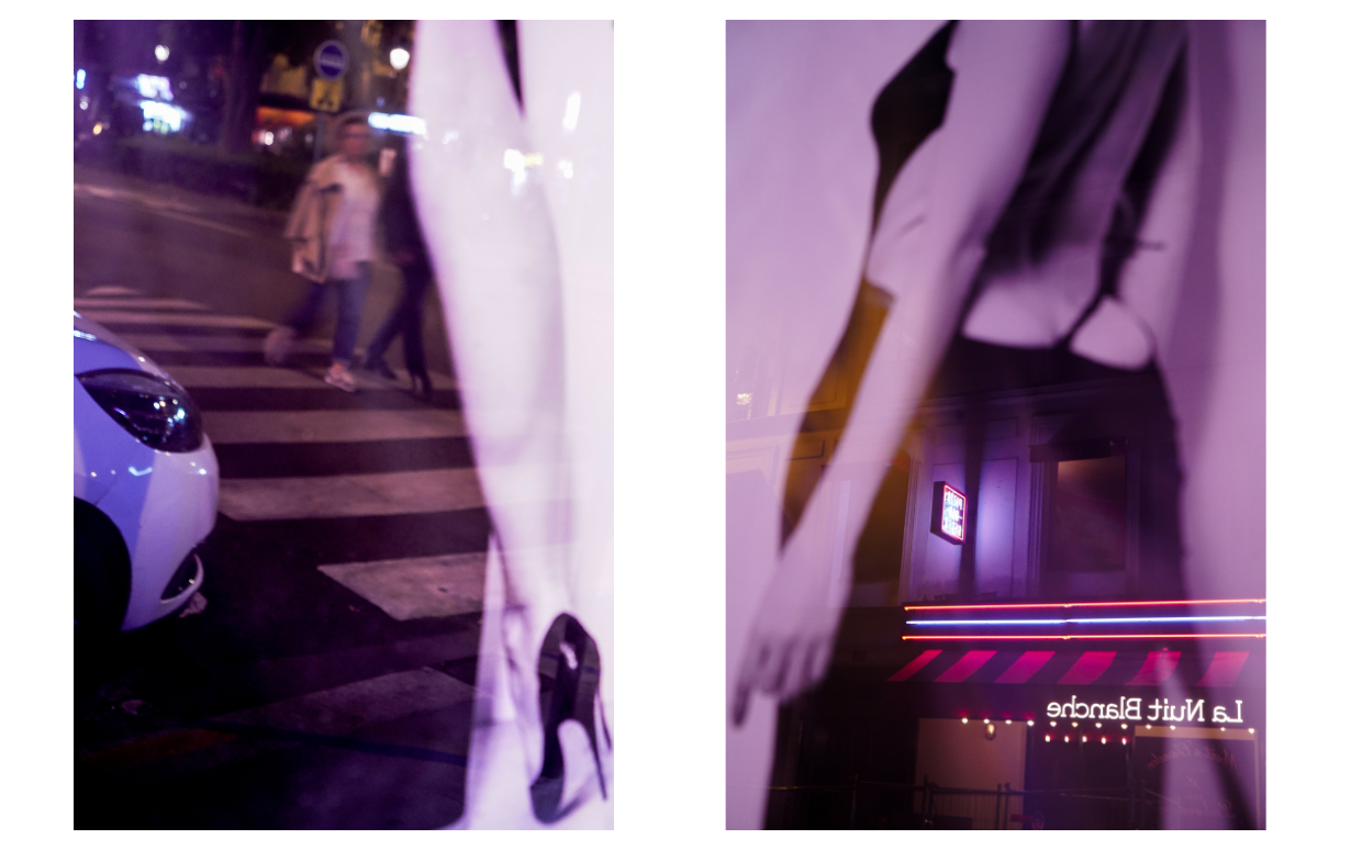 Pigalle serait un quartier parisien en bout de course, entend-on dire parfois. Depuis la fermeture et la démolition du mythique Bus Palladium, ainsi que du café quasi centenaire le Sans-Souci, tous deux disparus ces derniers mois, on serait presque tenté de se joindre à la mise au tombeau. Les travaux actuellement à l’œuvre place Pigalle, à la jonction du IXe et du XVIIIe arrondissement de Paris, parviennent par ailleurs difficilement à faire oublier que le dernier néon emblématique du lieu, celui du Folie’s, devrait à son tour bientôt être rasé pour laisser place à un mini-centre commercial – quand la nuit s’éteint, les promoteurs s’éveillent. Je vis dans ce quartier depuis presque dix ans, et j’y ai emménagé à une époque où il s’était déjà gentrifié. L’âme et l’histoire d’un lieu se laissent-elles si facilement effacer, ou subsistent-elles malgré tout dans les interstices ? C’est ce que j’essaye de traquer dans les reflets des vitrines du boulevard de Clichy, où s’alignent les sex-shops. Devenues essentiellement des attractions à touristes depuis le confort et la discrétion offerte par internet pour s’offrir un sex-toy ou regarder du porno, ces vitrines cachent parfois des fantômes qui ne sortent que la nuit. Les lumières s’y dispersent en effet sur différents plans : on joue avec la profondeur de champ, et une autre réalité, invisible au premier regard, apparaît. Affiché à l’envers, un néon y prend une signification nouvelle. Les réverbères semblent flotter dans l’air, écrivent une ligne mélodique sur une portée imaginaire, peut-être celle d’un air qu’on entendait autrefois dans les cabarets du coin.