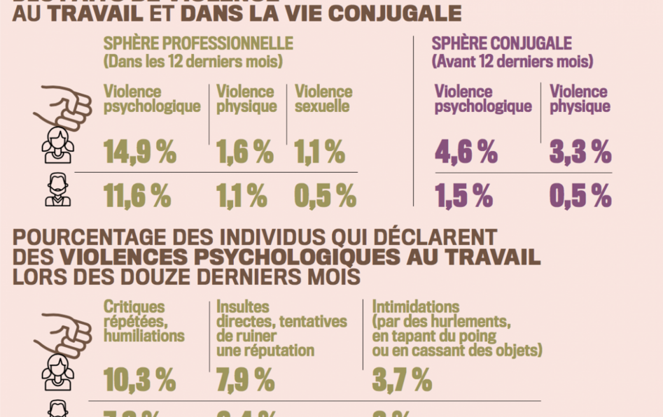 Cette enquête nationale est remarquable par son ampleur – 27 268 personnes interrogées – et par sa méthode : les faits violents y sont étudiés non seulement selon le genre mais aussi selon les sphères de vie, comme le couple, la rue ou le travail. Premier constat : l’espace public, et en particulier professionnel, apparaît plus violent que l’espace conjugal, et les hommes n’échappent pas au phénomène. L’écart entre ces deux « mondes » culmine dans les violences psychologiques déclarées. Au travail, elles sont 3 fois plus importantes pour les femmes et 7 fois plus pour les hommes.